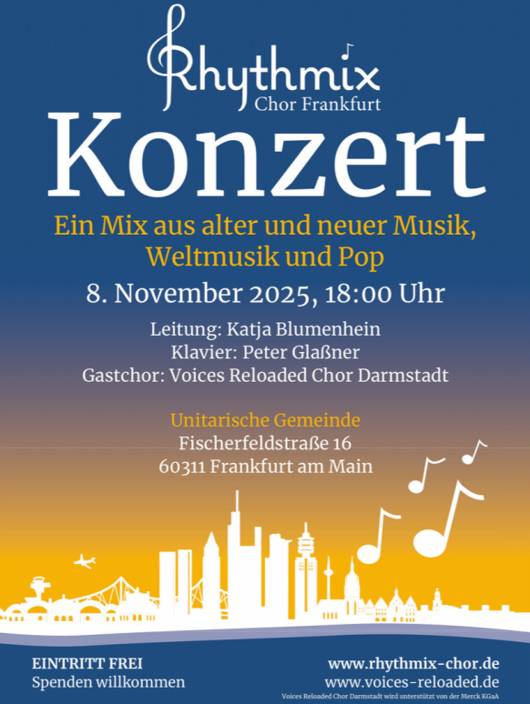 Wir freuen uns, am 08. November 2025 zusammen mit dem Rhythmix Chor Frankfurt ein Konzert veranstalten zu dürfen. Bei Stücken von Barock bis zum 21. Jahrundert ist für jeden Geschmack etwas dabei. Natürlich lassen wir uns einen kleinen Abstecher nach Südamerika auch bei diesem Konzert nicht nehmen.