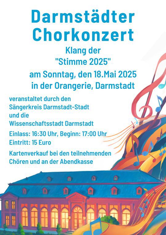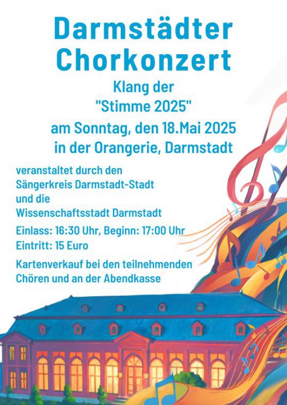 Der Sängerkreis Darmstadt-Stadt und die Wissenschaftsstadt Darmstadt veranstalten ein großes Chorkonzert am 18. Mai 2025 um 17 Uhr in der Orangerie Darmstadt. Hier präsentieren 7 Chöre die große Bandbreite der Darmstädter Chormusik, zusätzlich wird der Akkordeon-Konzertverein die Veranstaltung bereichern.